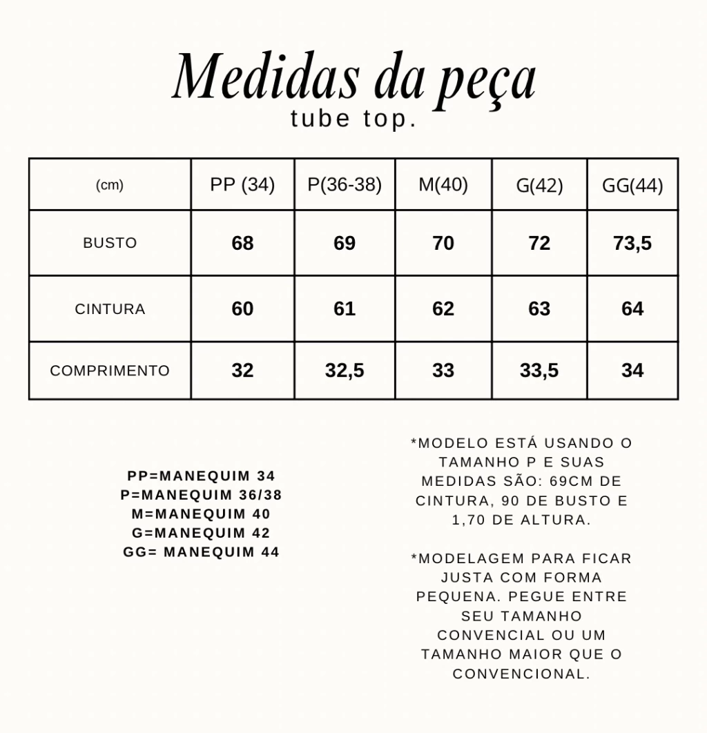 Nosso best seller tube top! Modelagem tubinho, justa e alongada. Com elástico grosso superior que garante uma maior sustentação para para seios grandes. Acabamento superior embutido e forrado no busto. Tecido de malha fria e respirável com ótima resistência a lavagens, feito para o dia-dia! Pode ser usada em várias ocasiões e de várias formas! (curtinho dobrando a barra para dentro, como body colocando ele por dentro da calça ou como blusinha). Peça super confortável e atemporal que não pode faltar no seu guarda-roupas :))